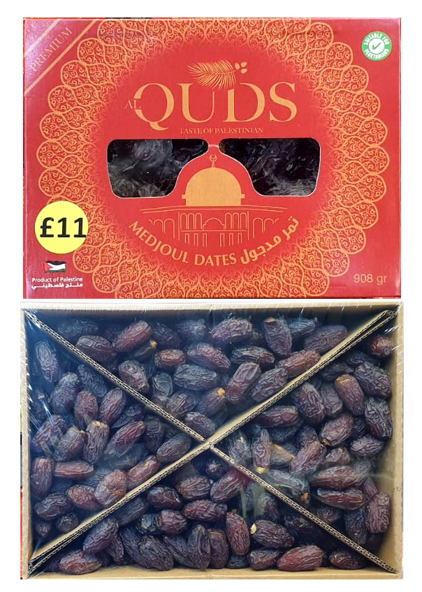 Brand: AL-QUDS Size/Vol.: 908 gm -These sweet, succulent 'Medjoul' Dates harvested near the historical Palestinian town of Jericho are the best we've ever tasted and are a big hit with our customers. This box contains a net weight of 1kg of supreme dates. These are fresh dates and of the highest quality carefully stored under a controlled cooled environment. These have been cultivated on Palestinian land by Palestinian farmers and packed by Palestinian workers.
