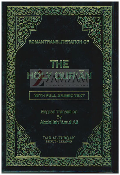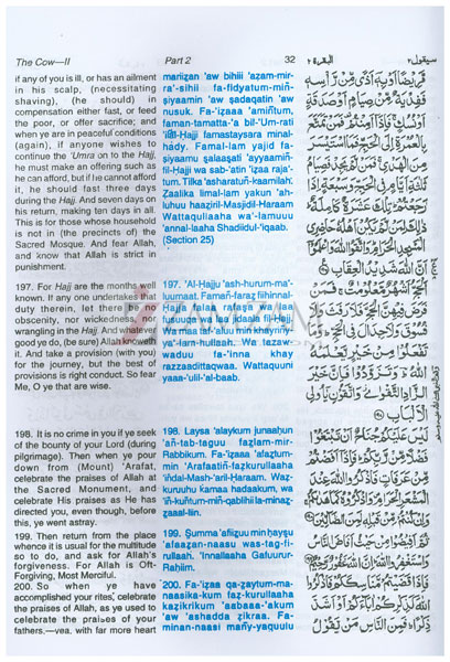 This is a classic Romanized Qur'an (English translation, Romanized letters indicating how to pronounce the Arabic, and the original Arabic text). Each page is split into 3 columns, each column containing the previously mentioned texts. The Abdullah Yusuf Ali translation is the modern edited version (old English words have been "upgraded" to modern standard English). The Roman transliteration, though not indicated, appears to be the world-travelled M.A.H. Eliyasee transliteration (set in blue ink, separate from the black ink of the English and Arabic). The Arabic script is "IndoPak" (Indian subcontinent familiar) style.